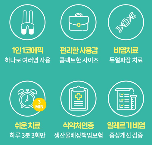 코에픽 장윤정 비염치료 가정용 비염치료기는 신개념 의료기기로, 한약재인 장윤정과 현대 의약학의 합작입니다. 제품은 쉽고 간단하게 사용할 수 있으며, 각종 알레르기성 비염과 만성 비부비증 치료를 위해 설계되었습니다. 이 제품은 집에서도 편리하게 사용 가능하며, 전문가들이 개발한 기능으로 더욱 효과적인 치료가 가능합니다.